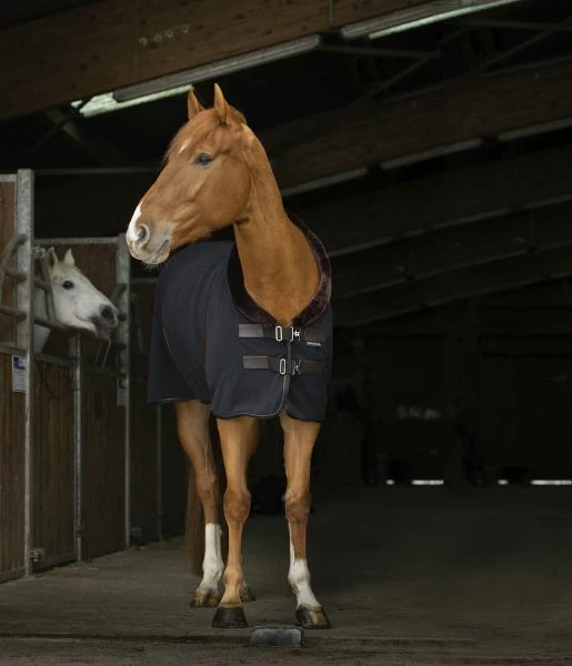 High-density polar fleece sheet features wide synthetic sheepskin neck. Low-cross surcingles and nylon chest. Chest closure with dual adjustable male/female buckles and self-gripping bands. Tail strap. Comfortable and robust, ideal in the stable or at competitions.