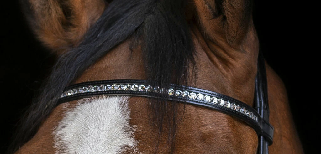 Italian leather bridle. Headpiece and browband feature decorative crystals. Pull Back noseband (with flash) is padded with supple leather.