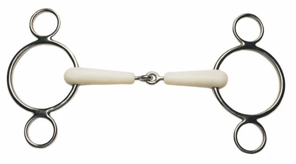 Flexi bits are soft and much warmer to the touch than metal bits. Ideal for younger horses or horses with a more sensitive mouth. Allows the rider to have two different levels of leverage and poll pressure depending on the needs of the horse with the lower ring providing the most leverage. The single joint applies a nut cracker action which applies pressure to the tongue, the bars of the mouth and the horse’s palate.