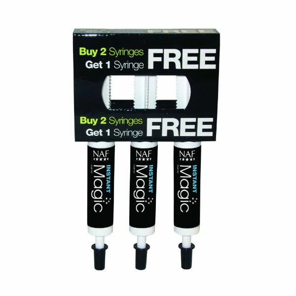 Instant Magic uses bio-available magnesium combined with a fast acting herbal base for an effective instant calming effect. Instant Magic is recommended for horses who only require the use of a calmer on an immediate, short term basis for specific potentially stressful situations; such as competition, clipping, travelling or a visit from the farrier or dentist. In addition it can be used to top up the calming effect of a daily Magic supplement as and when needed. Note: NAF are pleased to confirm that the magnesium used in Instant Magic does not contravene FEI rules and is safe for use in all horses.