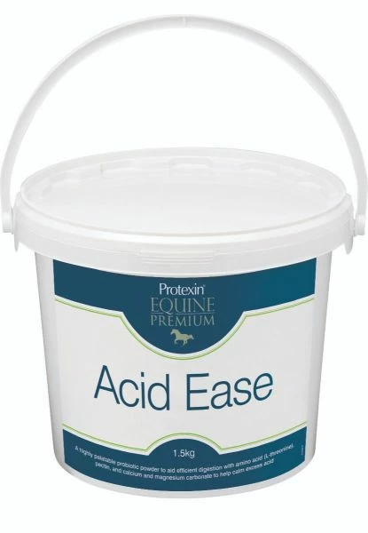 Acid Ease is a unique, concentrated, palatable combination of antacids, fibre, kaolin, amino acids and Protexin probiotics and prebiotics. Presented as a palatable powder, Acid Ease is suitable to calm excess acid in all horses and weaned foals. Acid Ease contains the antacids calcium carbonate and magnesium carbonate, as well as kaolin, pectin and L-threonine which together act to buffer excess acid and help protect and soothe the gut lining. The high quality fibres – pectin and psyllium help make this a superior product.