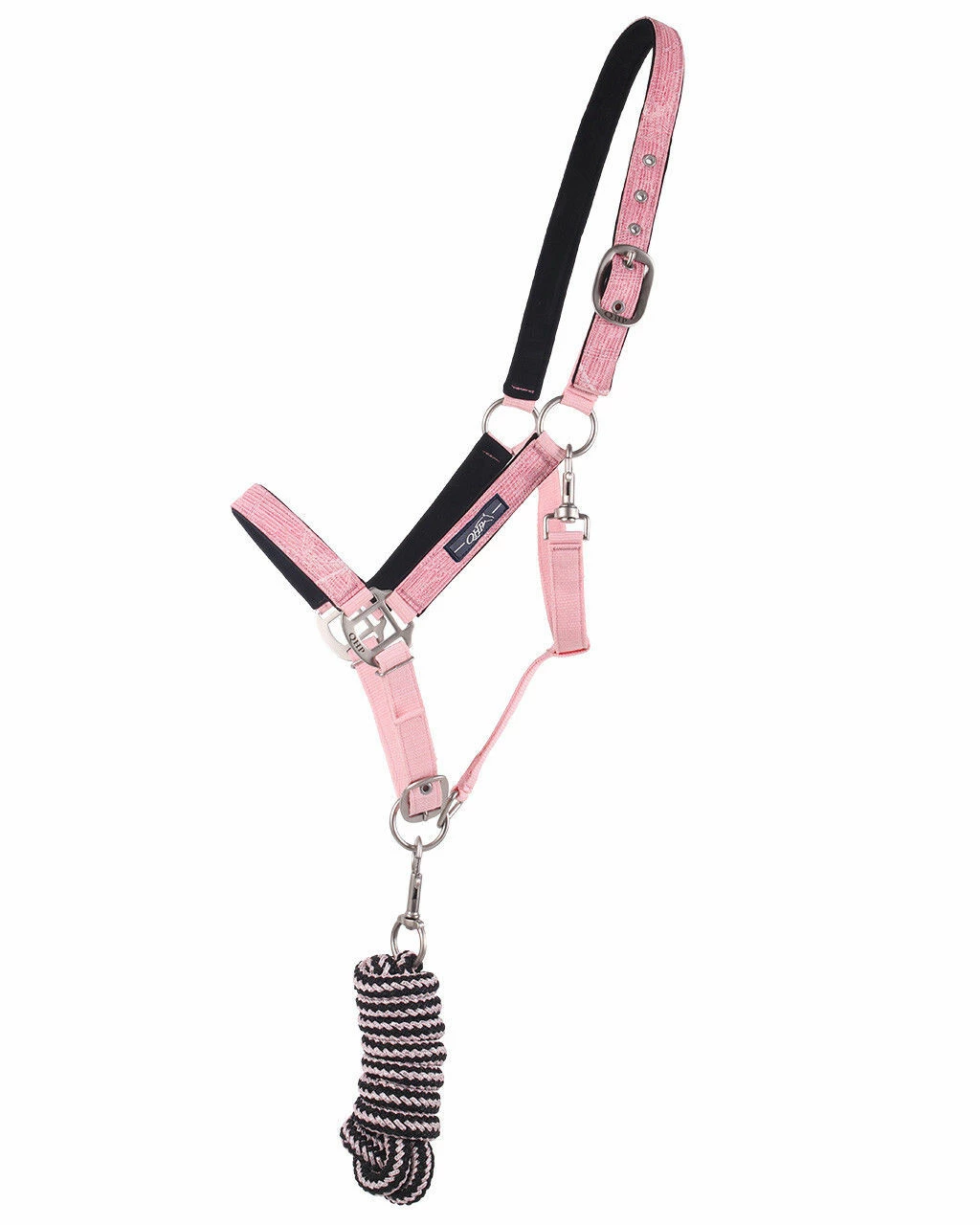 Padded head collar with a striking pattern. Features luxury satin finish hardware. Supplied with a matching lead rope.