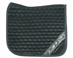 Stylish saddle pad with which you will shine in the ring or while training. The decorative cord, sequins and glitter text print create an elegant look. The saddle pad is fitted with girth loops that ensure that it stays in place.