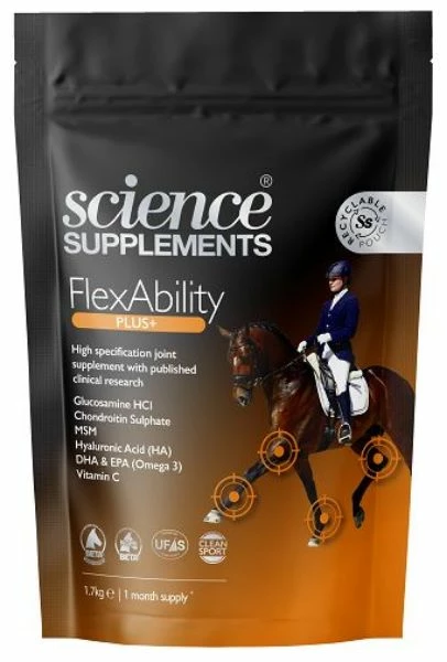 What’s different about FlexAbility+ PLUS? FlexAbility+ PLUS is one of the highest specification joint supplements available in the UK* and the only joint supplement on the market with two clinical and scientific studies demonstrating the positive effects of joint supplementation. FlexAbility is the only joint supplement in the UK with a published, peer reviewed paper in The Journal of Equine Veterinary Science. The study is the largest undertaken in recent history and the findings were also accepted and presented at the British Equine Veterinary Association Congress. The clinical trials suggest for stiff horses, 6-7 out of 10 fed FlexAbility benefit in maintaining normal joint function and mobility. Formulated for maximum effect with superior levels of active ingredients and scientifically evaluated.