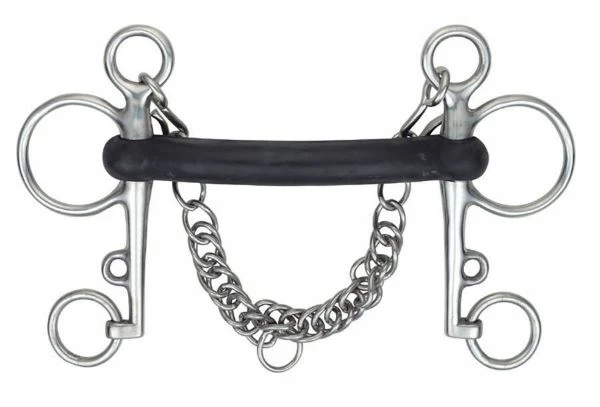 The hard rubber used in this pelham allows less movement but is still thick and gentle. Can be used with double reins or pelham roundings. Mouthpiece thickness: 19mm. Cheek height: 115mm (4.5″), 130mm (5″), 140mm (5.5″-6″).