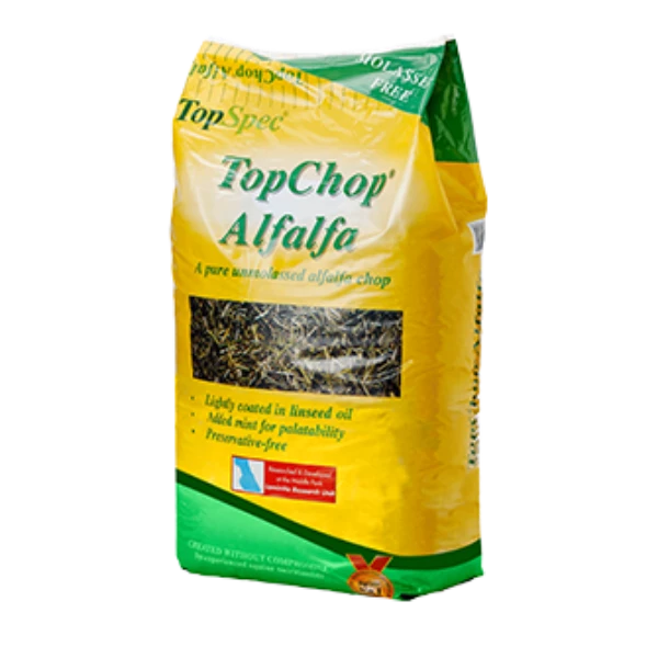 TopChop Alfalfa is of similar nutritional value to good quality haylage but contains less sugar. The formula for TopChop Alfalfa was tested and developed at the Middle Park Equine Research Centre and has been approved by the nutritional team as suitable for all horses and ponies other than those that need to lose weight (TopSpec nutritionists recommend TopChop Lite is used for horses and ponies that need to lose weight).