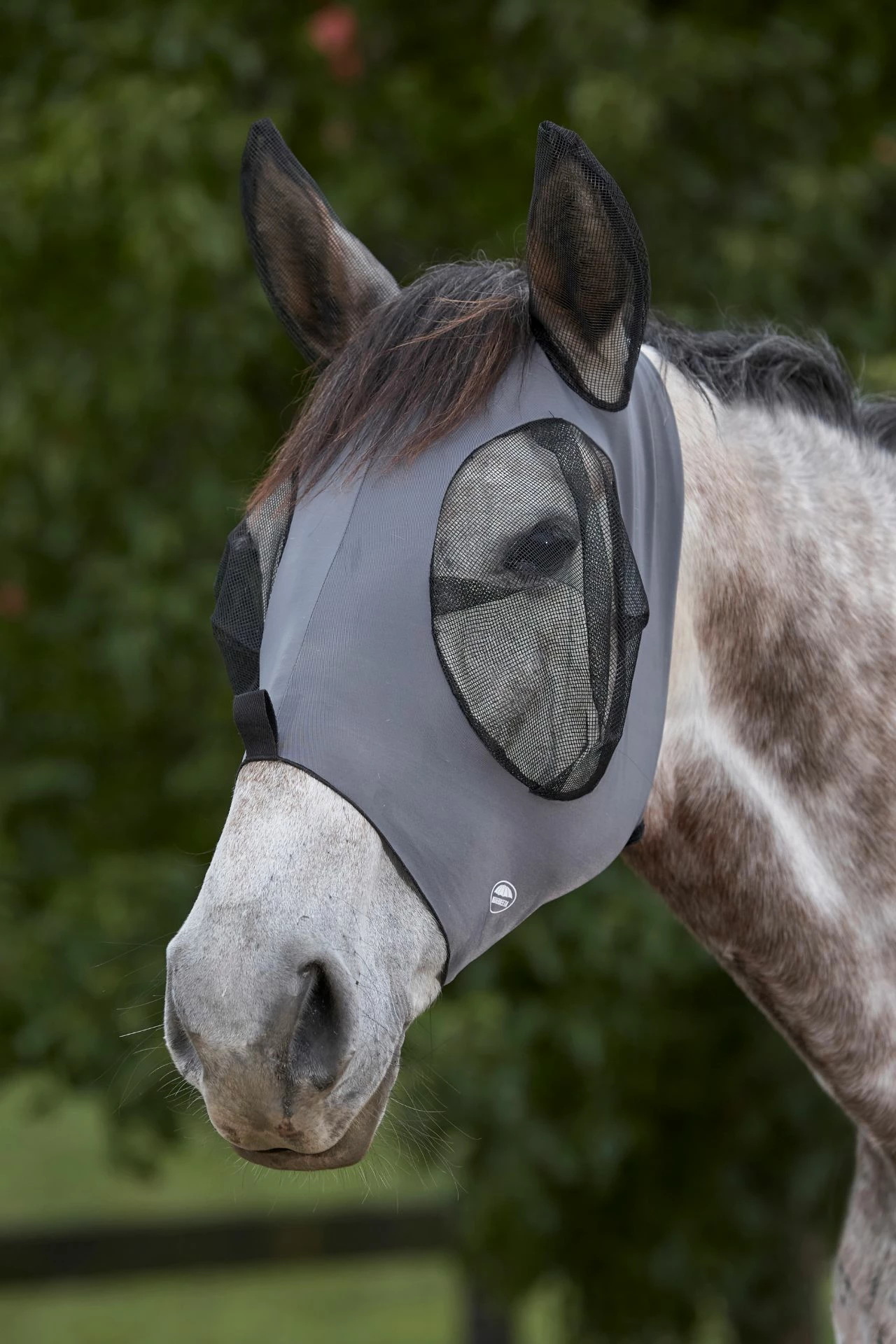 - The stretch fabric offers a secure fit around the horse’s head preventing insects from entering the mask.