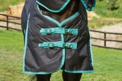 The Weatherbeeta Green-Tec Mediumweight 220g Detachable Neck Turnout Rug has been created using recycled plastics for the outer and lining, meaning each rug saves over 340 plastic bottles from going into the ocean or landfill and the way we have made it uses far less (over 50% less) energy. It is also packaged in recyclable packaging that is also made from PCR (post consumer recyclable plastic). This mediumweight turnout rug is waterproof and breathable, made from 900 denier fabric with a strong 150 denier diamond weave lining PCR fabric. This features a detachable neck for versatility and side gussets to allow freedom of movement. The quick clip front closure are adjustable with twin low cross surcingles, large tail flap for protection and removable, adjustable leg straps.